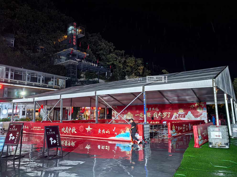 三門峽篷房出租克服山路難行、物料進場不易等多重挑戰,成功在老君山搭建起白色人字形篷房,即便國慶期間陰雨連綿,仍為1元午餐區筑牢了堅實保障,讓數萬游客在山間感受到溫暖與便捷。